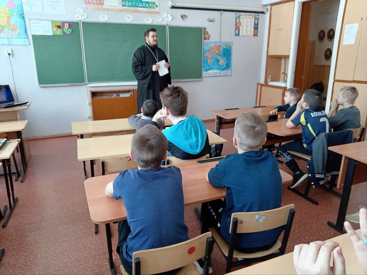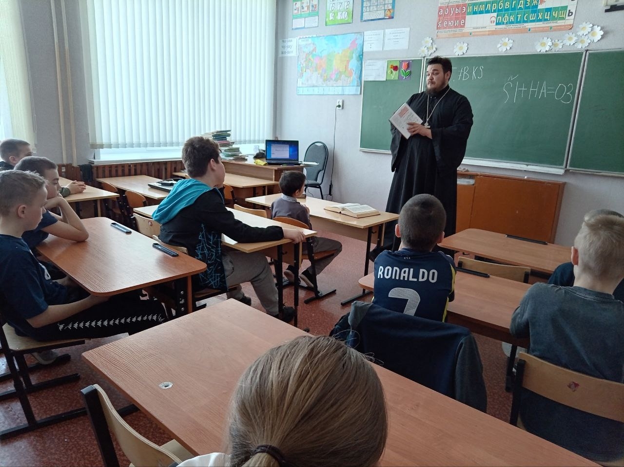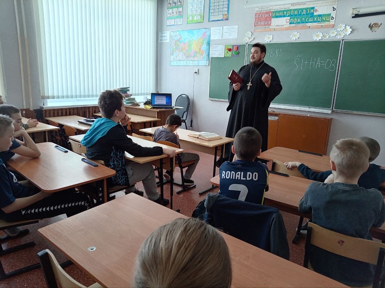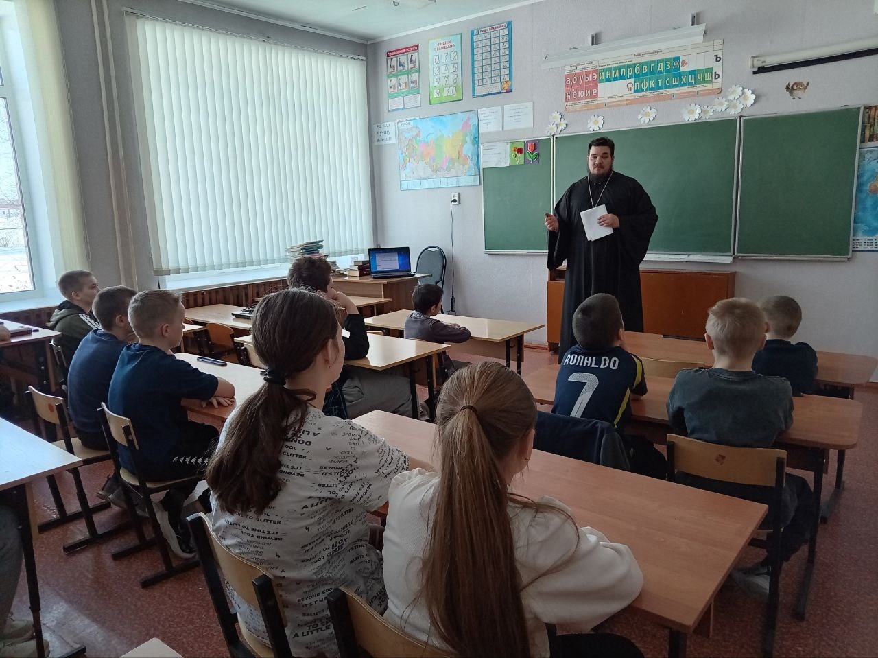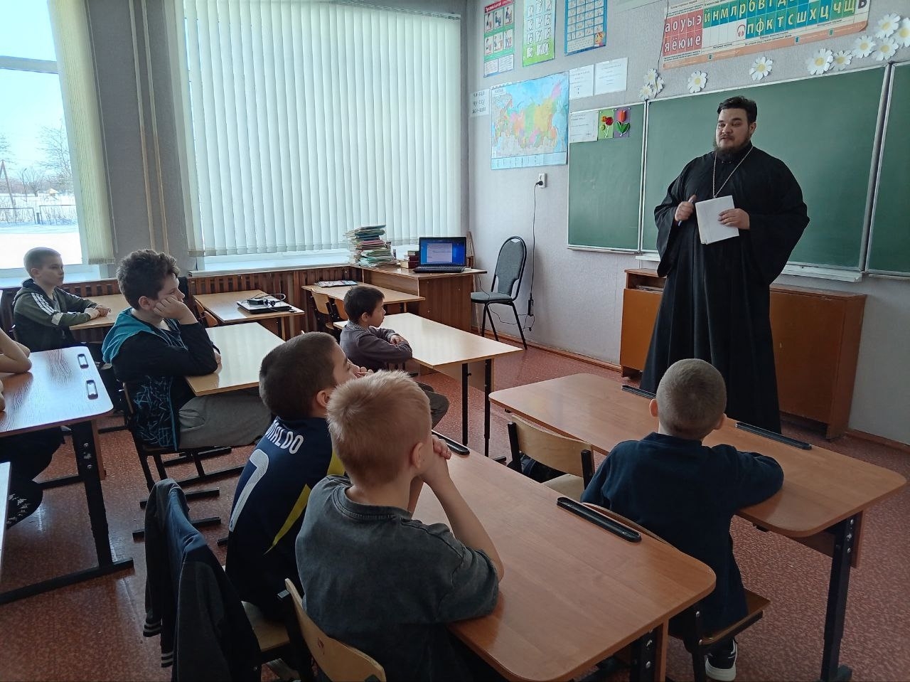 Отец Алексий готовился основательно: хотел показать ребятам красочную презентацию о том, как развивался русский алфавит, откуда пошли буквы, как менялась письменность на Руси. Но техника в сельской школе — дама капризная. Экран так и не загорелся.