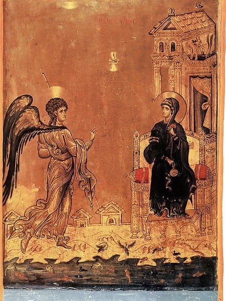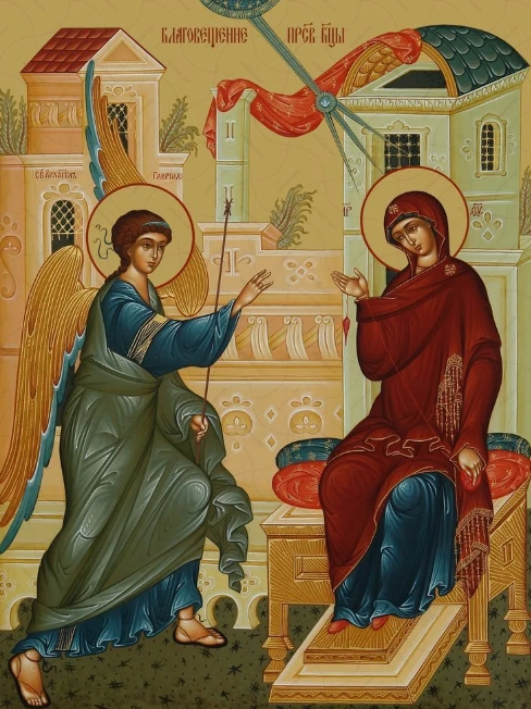 Однажды перед Ней явился Архангел Гавриил и возвестил, что Она станет Матерью Сына Божия. Мария удивилась и спросила, как может это быть, если Она хранит девство.