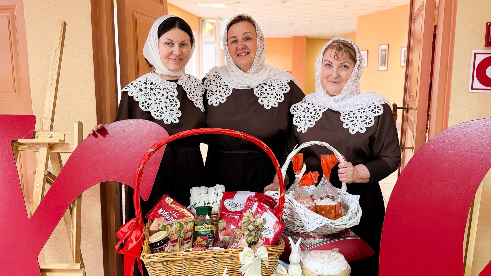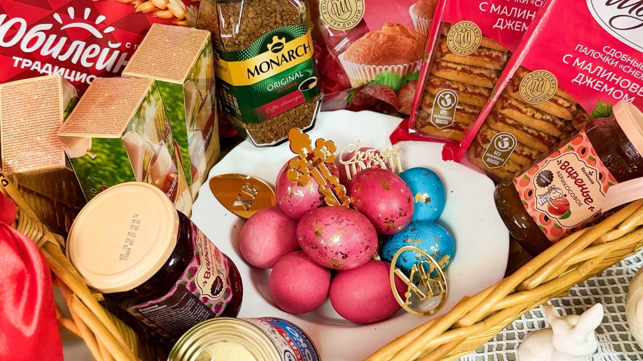 В каждой коробке — освящённые куличи, пасхальные яйца и сладости.
