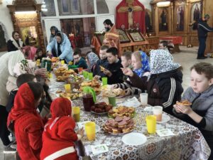 День начался с главного: в храме была совершена Божественная Литургия. Ребята молились вместе со взрослыми, а многие впервые осознанно участвовали в таинствах, которые совершаются за богослужением. Для школьников это стало живым сопричастием к великому чуду, которое Церковь переживает в пасхальные дни.